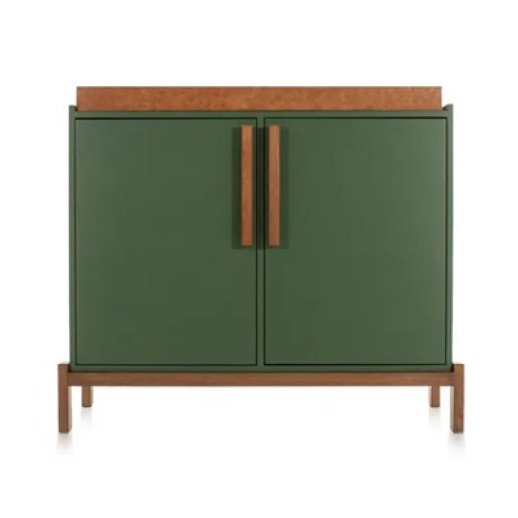 BALCÃO BAR VEGAS- Base e puxadores produzidos em madeira maciça de tauari tingido ou pintado em cores de laca, corpo e portas de MDF laminado em madeira natural ou pintados em cores de laca com bandeja que pode ser produzida com acabamento laminado, em recouro natural ou com espelho prata. A parte interna possuí adega em colméia, prateleira que pode ser em vidro ou madeira e gaveta.