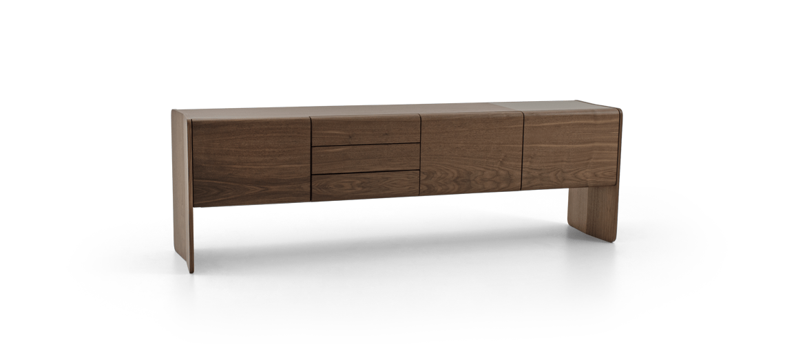 BALCÃO DOBRA- Estrutura em madeira, com detalhe laqueado no tampo, possui prateleiras internas