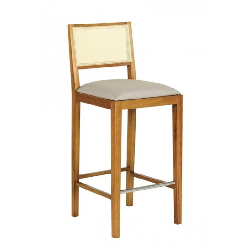 BANQUETA JAVA – Estrutura em madeira com detalhe metálico na base, assento em estofado e encosto em tela.
