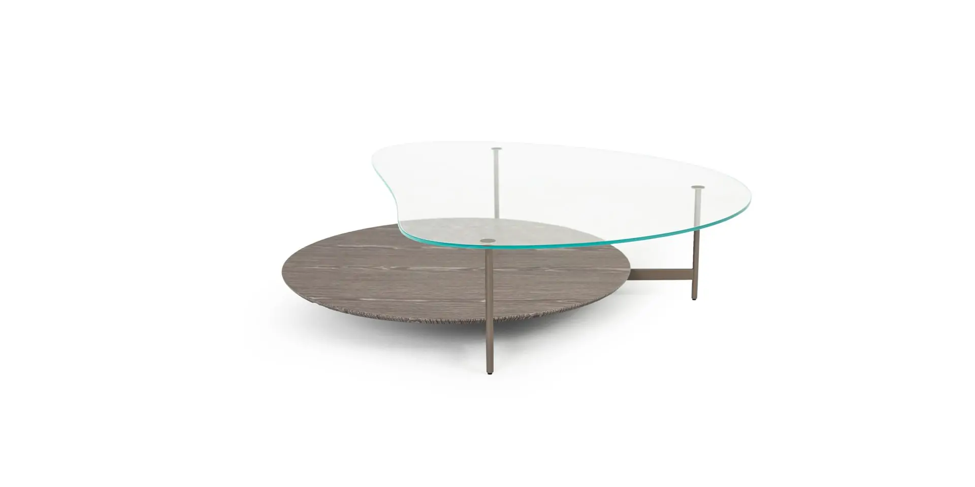 MESA DE CENTRO ESSENCE ORGÂNICA – Base em aço carbono, disponível nos acabamentos pintura MTX, pintura metalizada e pintura fosca. Tampo Inferior: com opção em mármore ou MDF, disponível no acabamento laminado. Tampo superior em vidro, com pinos fixadores em aço carbono.