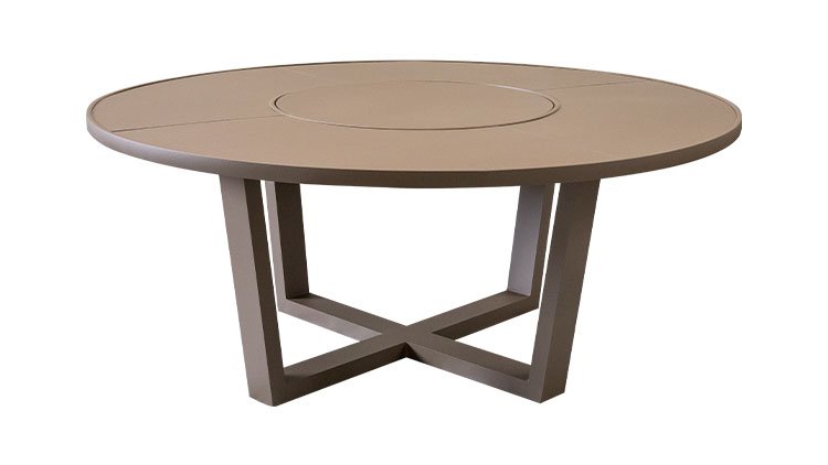 MESA DE JANTAR IMPERIAL- Estrutura em alumínio, tampo giratório sobreposto em cumaru ou freijó.