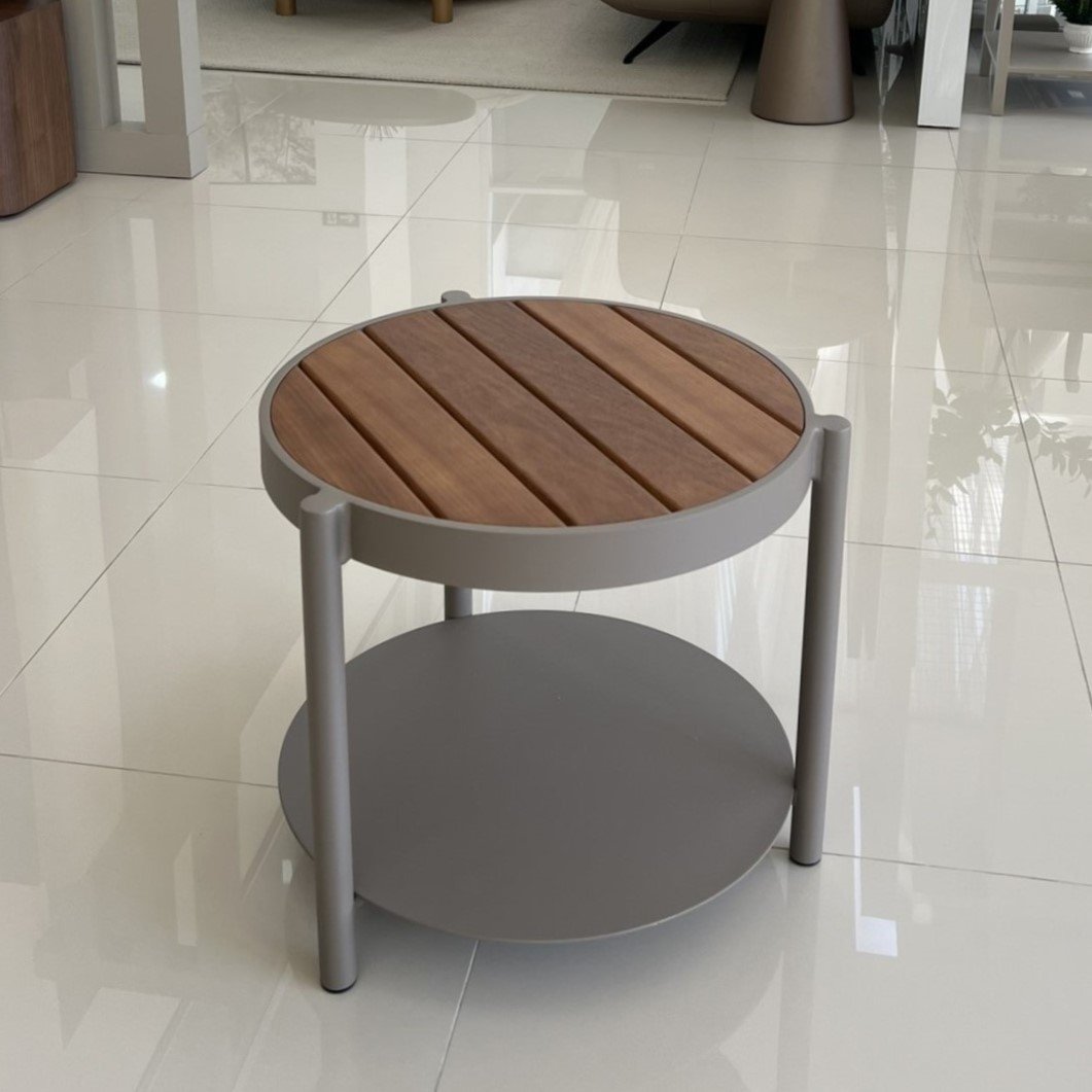 MESA LATERAL DALLAS- Estrutura em alumínio e tampo em madeira freijó. Dimensões: 56cm diametro x 46cm altura