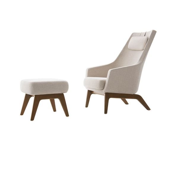 POLTRONA AVOND- Base em madeira, assento e encosto estofados, braços estofados e apoio para cabeça com regulagem de altura.