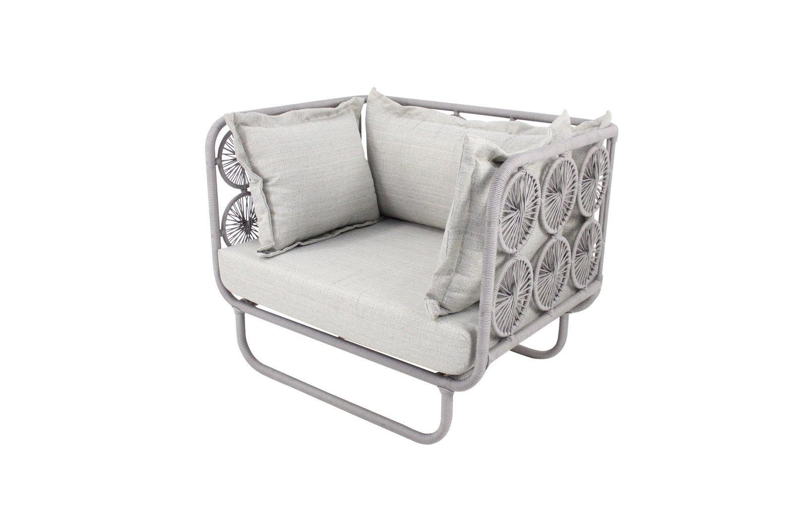 POLTRONA BAIXA ERYS- Estrutura em alumínio revestida em corda náutica ou trama erys.Assento e encosto estofados, acompanha almofada.