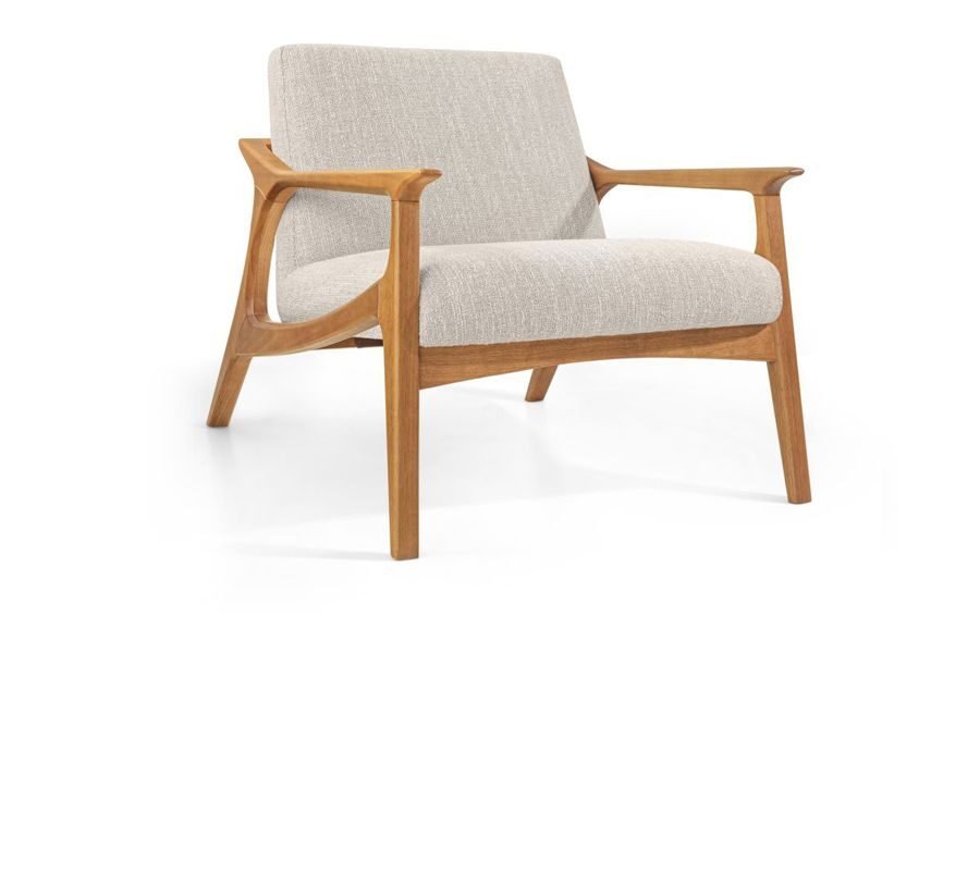 POLTRONA COPAN- Base em madeira tauari trabalhada com chanfros e boleados, assento e encosto estofados, possui detalhe em couro no encosto na parte de trás.
