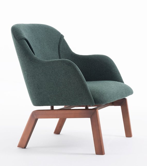 POLTRONA DUNAS – Base de metal com acabamento de capa de madeira natural, assento e encostos estofados.