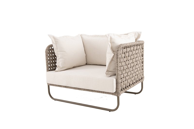 POLTRONA VITTA- Estrutura em aluminio, assento e encosto estofados, encosto e braços em corda nautica.