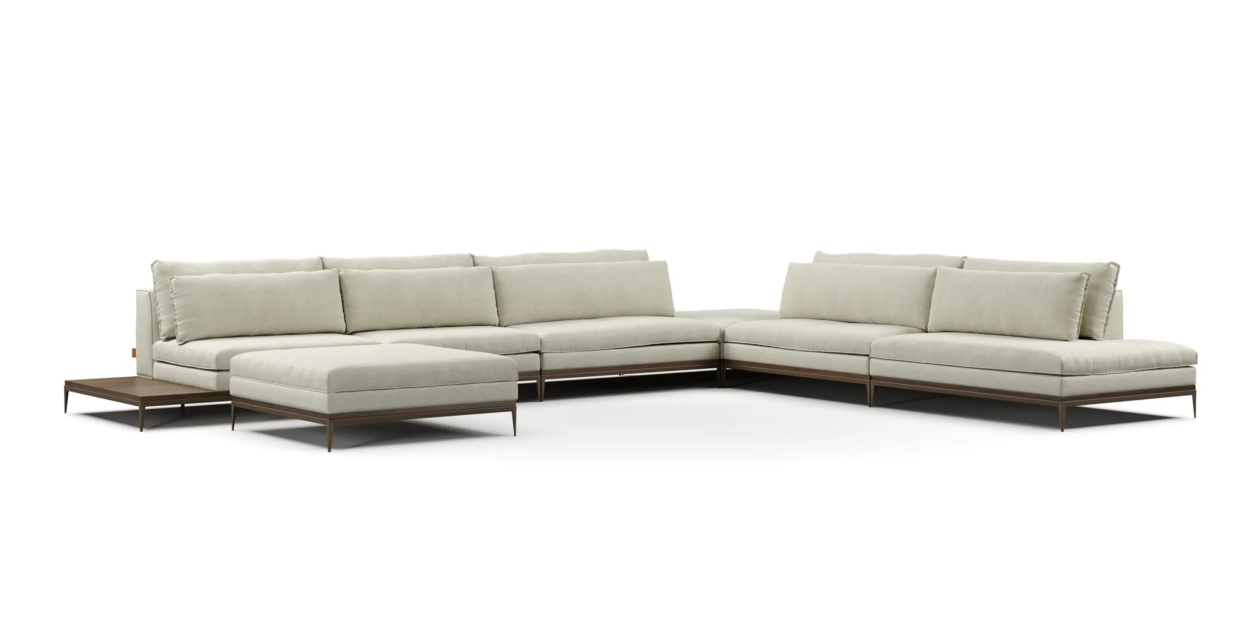 SOFÁ ALLADRO- Sofá modular com base em aço carbono com pintura MTX e metalizada ou tatame em madeira no acabamento laminado. Encosto e braço fixos, assento e encosto estofados. Tamanho a definir.