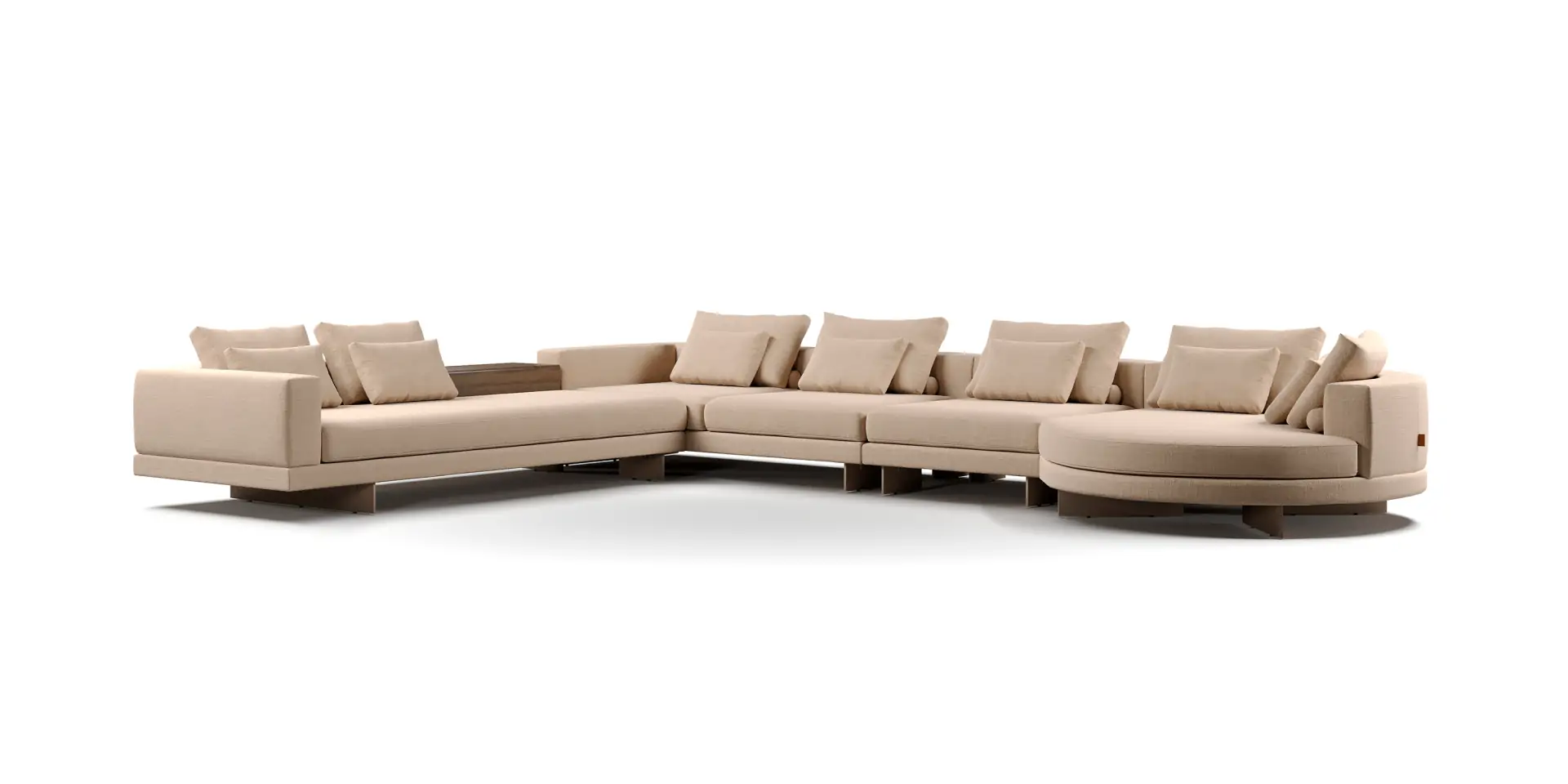 SOFÁ BANAT – Sofá modular com base em madeira disponíveis nos acabamentos laminado, pintura laca e pintura verniz. Assento e encosto fixos e estofados, tamanho a definir.