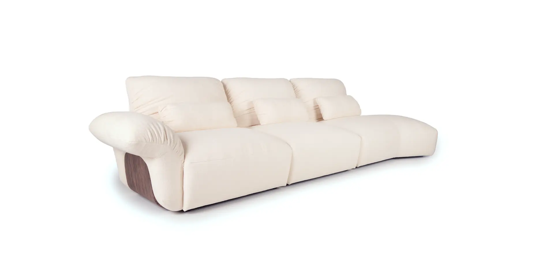 SOFÁ WINTER- Sofá modular com base em polipropileno na cor preta, assento e braços fixos, encosto articulado, sem detalhe de costura. Detalhe do braço em madeira, nos acabamentos laminado, laca e laca metalizado.